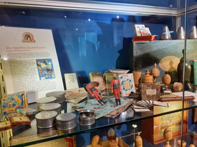 Das Foto zeigt das erste große Highlight des Museums, einen Zauberkasten aus dem 19. Jahrhundert, mit seinem ausgebreiteten Inhalt. Es ist der Originalzauberkasten, den ein gewisser Johann Wolfgang von Goethe seinen zwei Enkeln geschenkt hat.