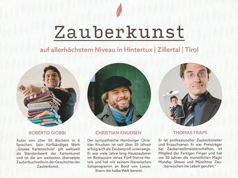 Nach der Kreuzfahrt war ich gleich noch als Zauberer eine Woche im Zillertal in den tiefsten Alpen, um mit zwei Profikollegen von mir Workshoptage für Hobbyzauberer zu gestalten, die dort mit ihren Familien Urlaub machten (organisiert von der Zauberschule Jedinat). Tolles Fünfsterne-Hotel, inklusive Whirlpool in freier Natur, umzingelt von weißbedeckten Gipfeln im strahlenden Sonnenschein. Postkartenidylle.