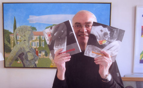 Der Mann dort auf dem Foto, der so sympathisch zwischen zwei Fachbüchern von mir hervorlugt, zum Beweis, dass er die Bücher erhalten hat, das ist Volker Huber, Deutschlands größter und bedeutendster Sammler von Kunstwerken, Büchern, Schriften, Artefakten, Requisiten und Apparaten zur Zauberkunst. Seine Sammlung füllte drei Reihenhäuser, vom Keller bis unters Dach. Seine Galerie Huber vertrat Künstler wie Bruno Bruni oder Paul Wunderlich. Seine Edition Huber publizierte erlesene Bücher.